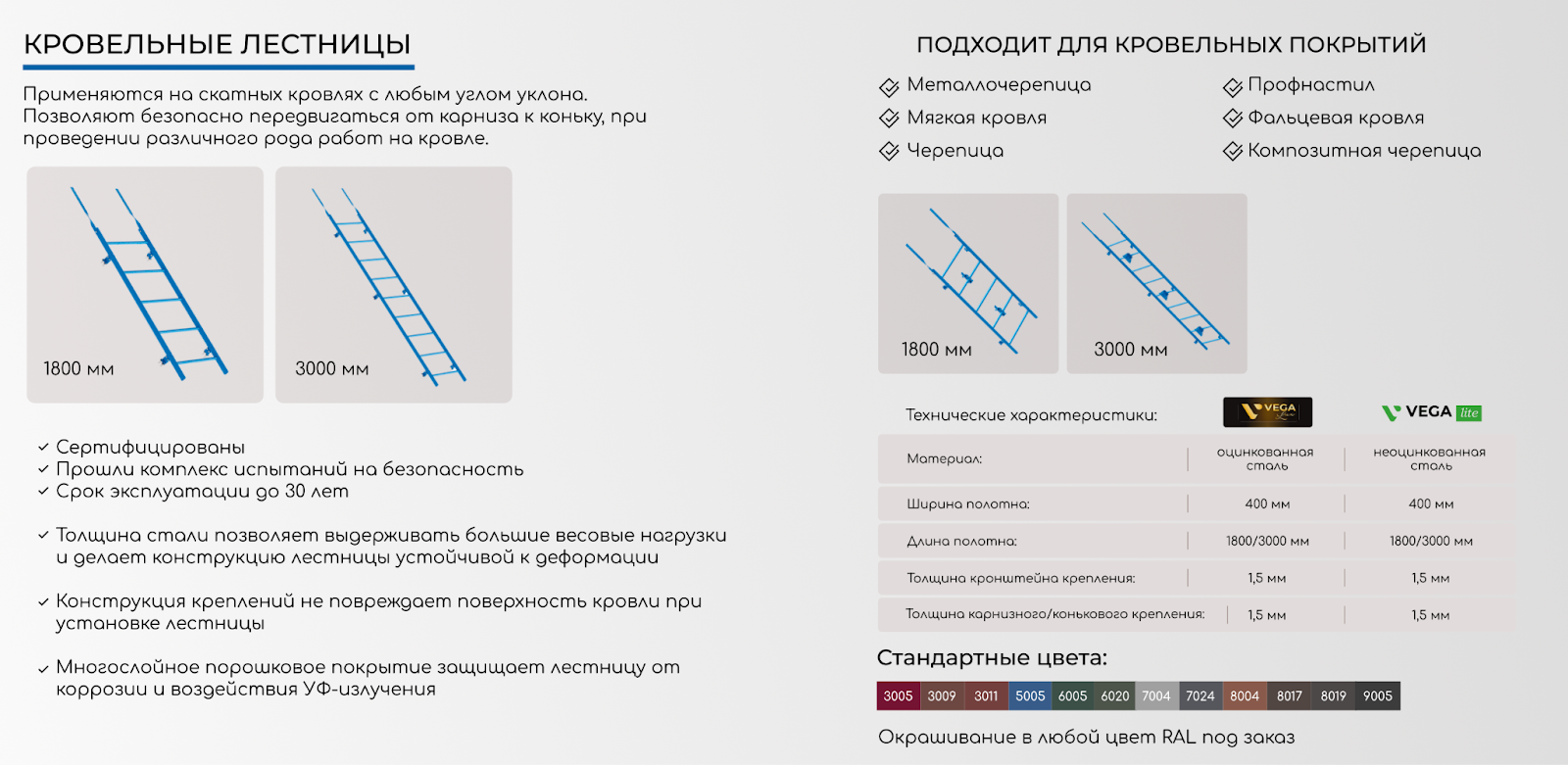 Кровельная лестница применяется на скатных кровлях с любым углом уклона. Позволяет безопасно передвигаться от карниза к коньку при проведении технического обслуживания, установке элементов крыши, телевизионных антенн и других надкровельных конструкций.